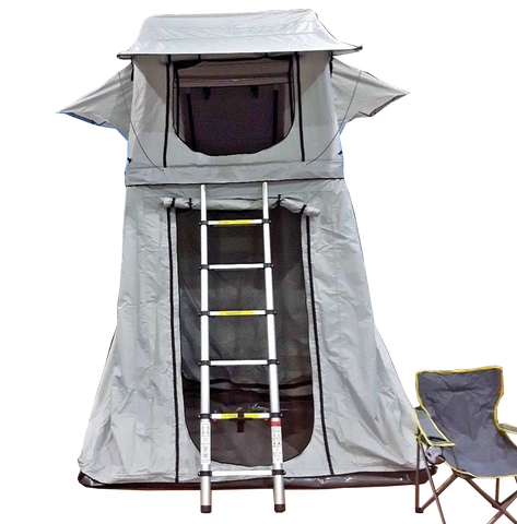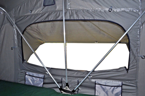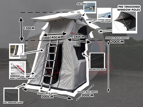 The zip on annex is one of the best features to complete the roof top tent system. This provides a whole other room, which can be used to keep a kitchen, your wet or dirty clothing or other items. You even have enough room to sleep 2 people in there. The main annex is made from the same durable and waterproof material that is on the outer of the tent. There is 1 entrance and 2 windows to either side, these all have anti insect netting integrated, so you can have the option of fully opened, open with anti insect netting or fully closed. It has a fully waterproof PVC groundsheet on the floor which is zipped together with the main annex.